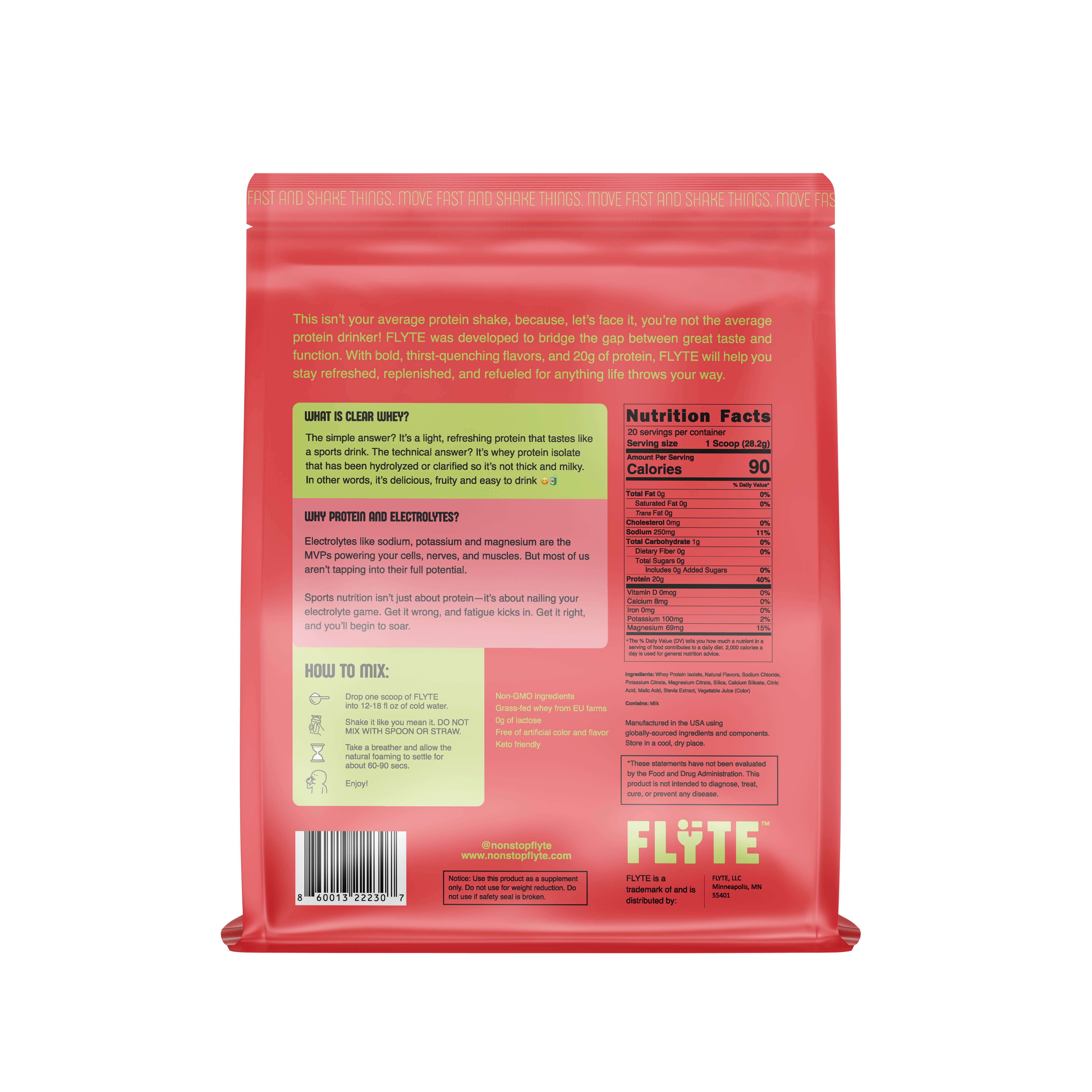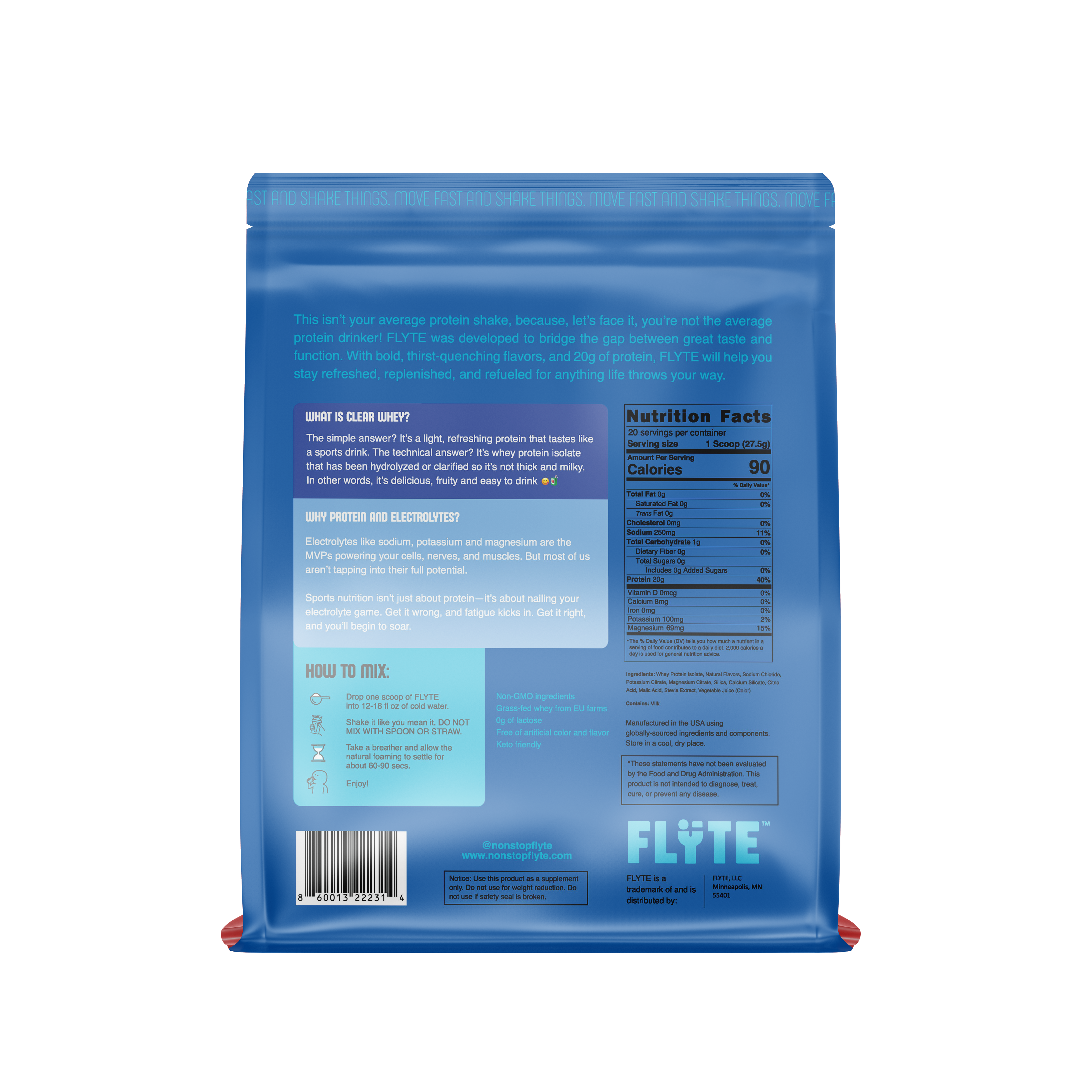 FLYTE is everything your chalky shake isn’t; refreshing, fast-digesting, and easy on your stomach. Each serving delivers 20g of whey isolate plus electrolytes to hydrate and recover without the heavy feeling.